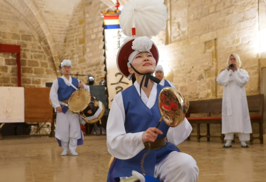 18h initiation K-pop avec Elena (November crew, professeur de danse à Printemps Coréen Kim Dong-ho : janggu / Choi Kyong-a : kkwaenggwari, chant / Kim Hyun : taepyeongso / Choi Woong-sik : buk / Jeong Byeong-in : tigre (lion traditionnel) / Ahn Tae-ho : beona nori / Oh Seran : danse / No Byeong-yu Weon Hyejin : conception du projet Geuru présente des spectacles mêlant musique, danse et jeux collectifs, basés sur le gugak, le nongak, le pangut et les danses traditionnelles. LA PRIÈRE DE LA GRAND-MÈRE C’est une danse rituelle de voeux et de prières pour son fils bûcheron pour qu’il ne soit pas la proie du tigre. LA FÊTE DU VILLAGE La fête en l’honneur du fils-tigre est représentée par un pangut de samulnori et des performances individuelles : Pangut, solo de kkwaenggwari, solo de sogo, et danse de la grand-mère et du tigre. 20h00 Crews K-pop Show