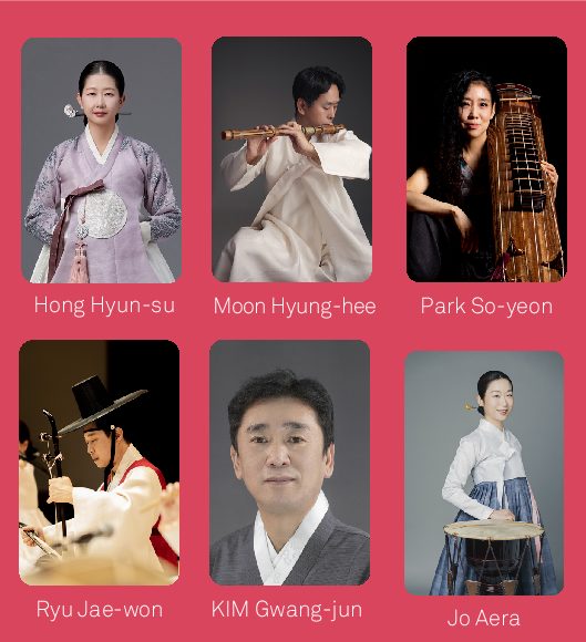 Musique traditionnelle Hong hyun-soo: chant / Moon hyung hee: daegum / Ryu Jae Won: Haegum / KIM Gwang jun: piri / Park so yeon : geomungo / Jo Aera: janggu. 18h30 : discours des organisateurs et des partenaires officiels Artistes coréens soutenus par K-arts on Go