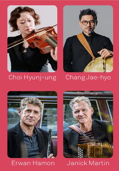 Choi Hyun-jun : Viola d’Amore Chang Jae-hyo : chant et percussion Erwan Hamon : bombarde, flûte traversière en bois Janick Martin : accordéon diatonique. Le projet « Cercle des cultures » est une création musicale qui fait dialoguer la culture de la danse bretonne (le fest-noz) et celle de la danse traditionnelle coréenne – le Ganggangsullae. Danses fondées sur le cercle, la rotation, le rythme et la convivialité, les musicien·nes spécialistes de ces chorégraphies jouent alors un folklore imaginaire en mouvement.