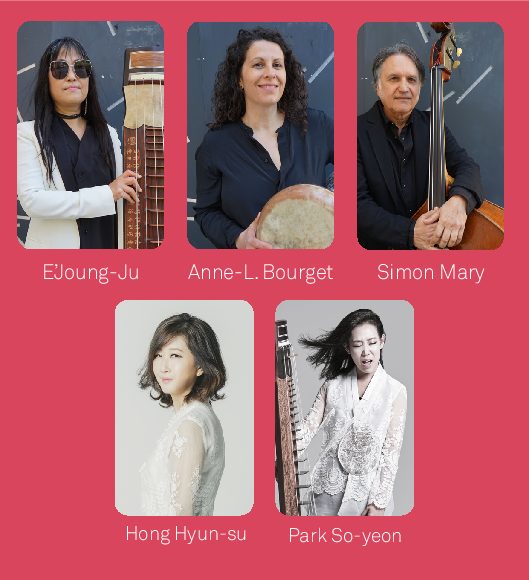 E’ Joung-Ju : geomungo Anne-Laure Bourget : percussions Simon Mary : contrebasse Hong hyun-soo : chant Park so yeon : clavier. Le trio Samin Dong Rak célèbre la diversité culturelle et le dialogue musical entre l’Orient et l’Occident. En s’associant, aux deux musiciennes Hong hyun-soo et Park So-yeon, le quintet nous livre une musique de sanjo mêlée à des sonorités contemporaines. Cette fusion prend vie grâce aux influences jazz du contrebassiste Simon Mary et aux voix puissantes et expressives de Hong Hyun-su et Park So-yeon.